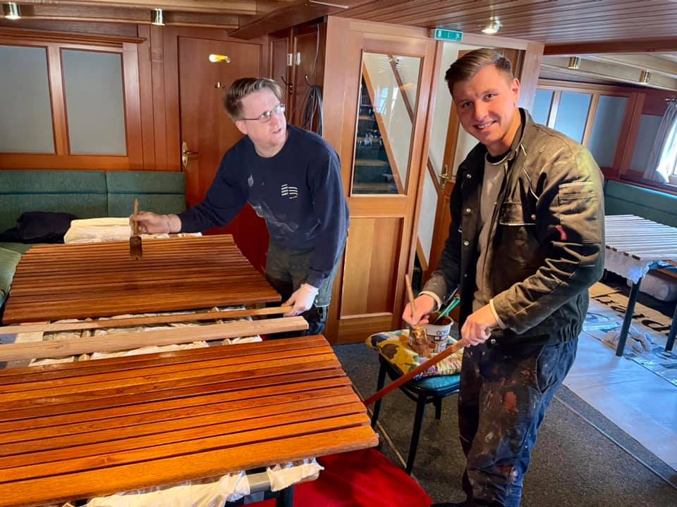 Wir waren neugierig und haben einen Kurzbesuch stellvertretend auf dem PD “Dresden” gemacht. Hier werden konkret die Bänke vom Sonnendeck renoviert. 1800 Holzlatten werden geschliffen und 5 mal gestrichen, um danach wieder neu verschraubt zu werden. Kapitän Andreas Weber und die Jungs der Besatzung (Christian Geerdes / Steuermann und Lucas-Amadeus Ebersbach / Bootsmann) haben ihre schicken Uniformen in Arbeitskleidung getauscht, um sich dieser Aufgabe zu stellen. Wir wünschen viel Erfolg bei allen anstehenden Arbeiten und sagen Danke für den Blick hinter die Kulissen!